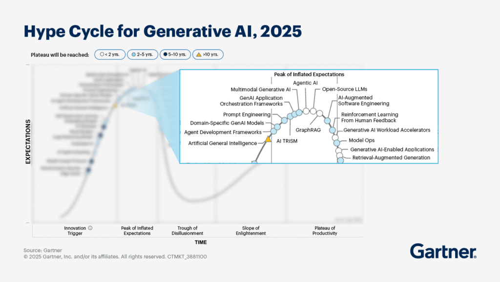 Tehnologije se razvijajo hitro, še hitreje pa naraščajo pričakovanja, ki jih imamo do njih. Na področju umetne inteligence se to najbolje vidi pri vsakoletnih napovedih, ki jih pripravlja analitska hiša Gartner. Krivulja prikazuje, kako različne rešitve in pristope prehajajo skozi val navdušenja, razočaranja in končno – realne vrednosti. Letošnji graf je še posebej zanimiv, saj prinaša pomembno sporočilo: prihaja čas treznih odločitev.